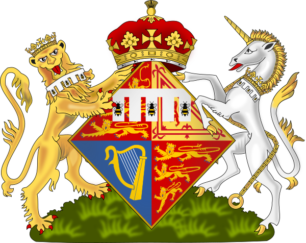 Prince Beatrice of York, Mrs Edoardo Mapelli Mozzi, is the elder daughter of Prince Andrew, Duke of York, and a granddaughter of Queen Elizabeth II. As a grandchild of a sovereign, Princess Beatrice bears the royal arms differenced by a label of five points, in her case the outer and centre points contain bees, from her mother's coat of arms and also a play on her name. Her coronet contains alternate crosses patée and strawberry leaves. |