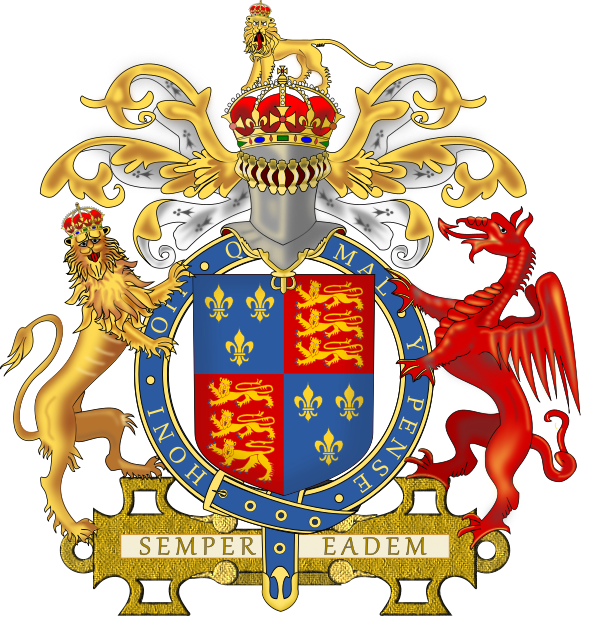 Elizabeth I was the daughter of King Henry VIII and Ann Boleyn, and in her 44 year reign she presided over the re-establishment of Protestantism, the defeat of the Spanish Armada, and the beginnings of England's and Britain's overseas empire. Elizabeth was the last monarch of the House of Tudor, and the last monarch to use the quartered arms of France and England on their own. Like other Tudor monarchs the dexter supporter of her arms was a Welsh dragon. This also ceased to be used after the end of her reign, being replaced by a Scottish unicorn. The number of arches shown on the royal crown was inconsistent during this period, with some artists showing four arches (as illustrated here) and others two (which became the norm, and remains so today). |